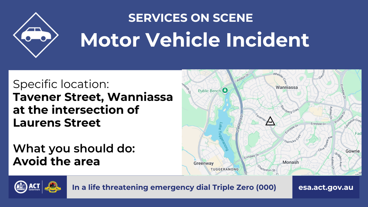 There's been a motor vehicle incident on Taverner Street in Wanniassa, near the intersection of Laurens Street.