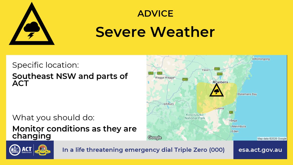 The Bureau of Meteorology has issued a severe thunderstorm warning, which is likely to produce large hailstones, heavy rainfall that may lead to flash flooding and damaging winds in the warning area over the next several hours. Locations which may be affected include Canberra, Cooma, Braidwood, Mount Ginini, Adaminaby, Araluen and Captains Flat.