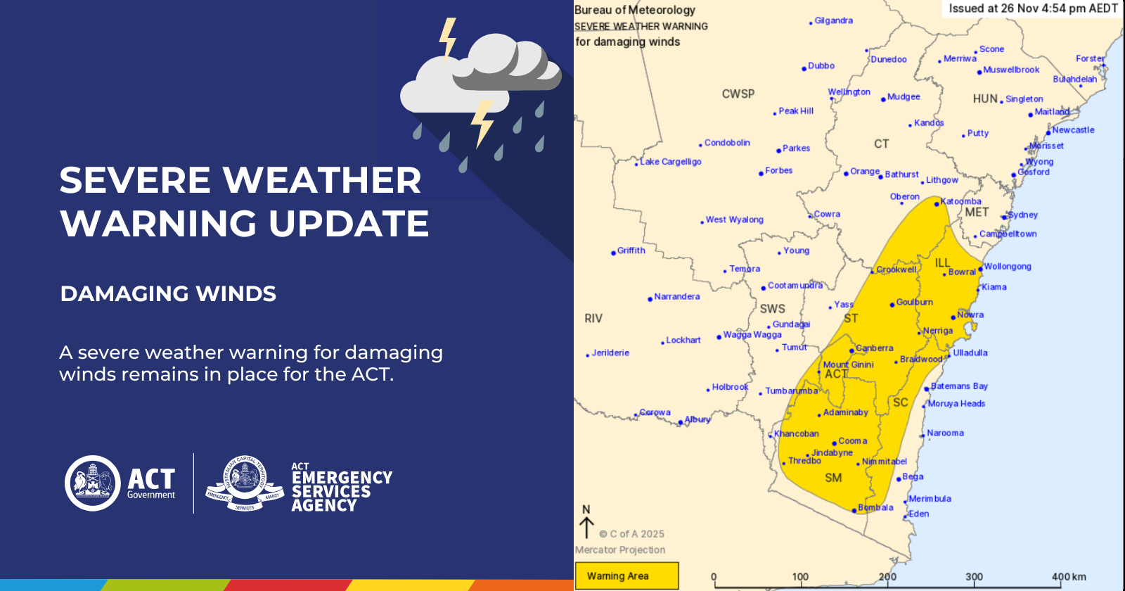A severe weather warning for damaging winds remains in place for the ACT. Conditions are expected to continue for the next few hours before easing later this evening.