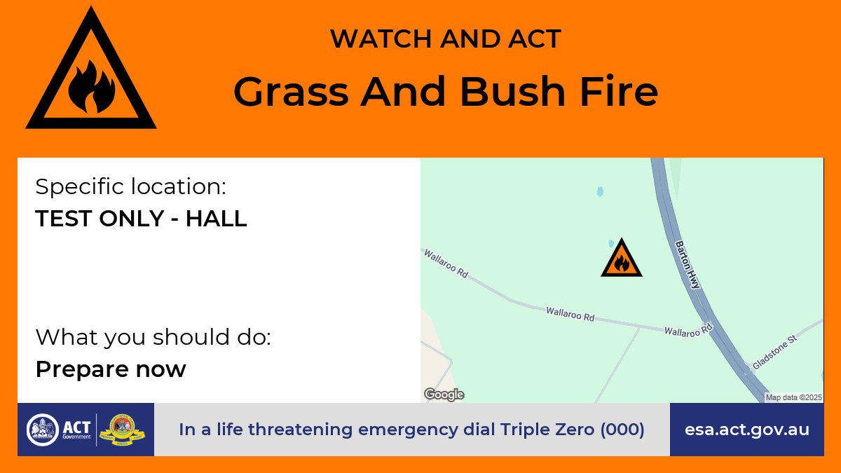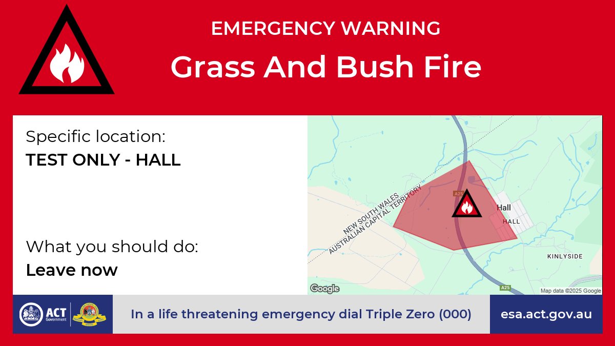 TEST, TEST - This is a test of the ACT’s warning system. No action or response is required from the public. You will see further tests like this during the next hour. For further information go to www.esa.act.gov.au or telephone Access Canberra on 13 22 81.